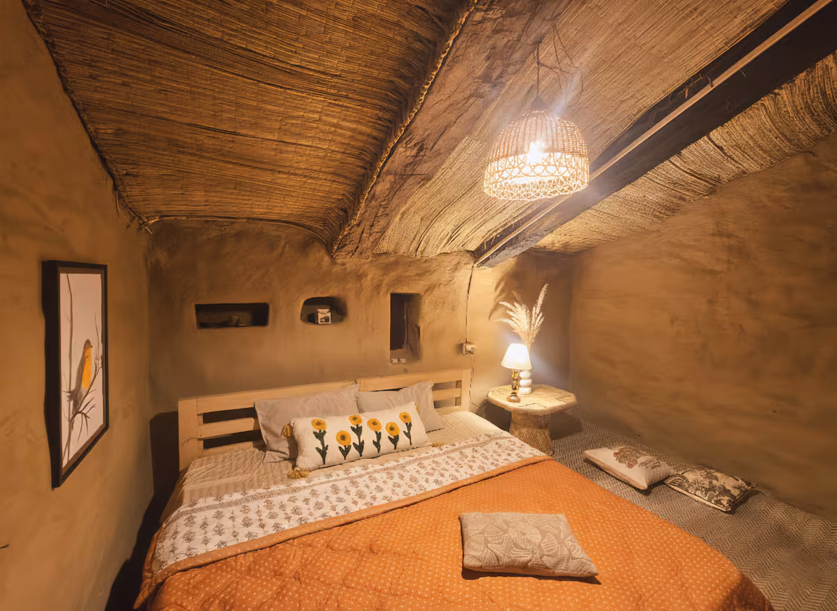 Stay in Soulful Simplicity: 3 Earthen Double-Bed Rooms Built with local rock, stone slates, and mud-plastered walls, our rooms offer the warmth of authentic mountain living, combining rustic charm with natural comfort.