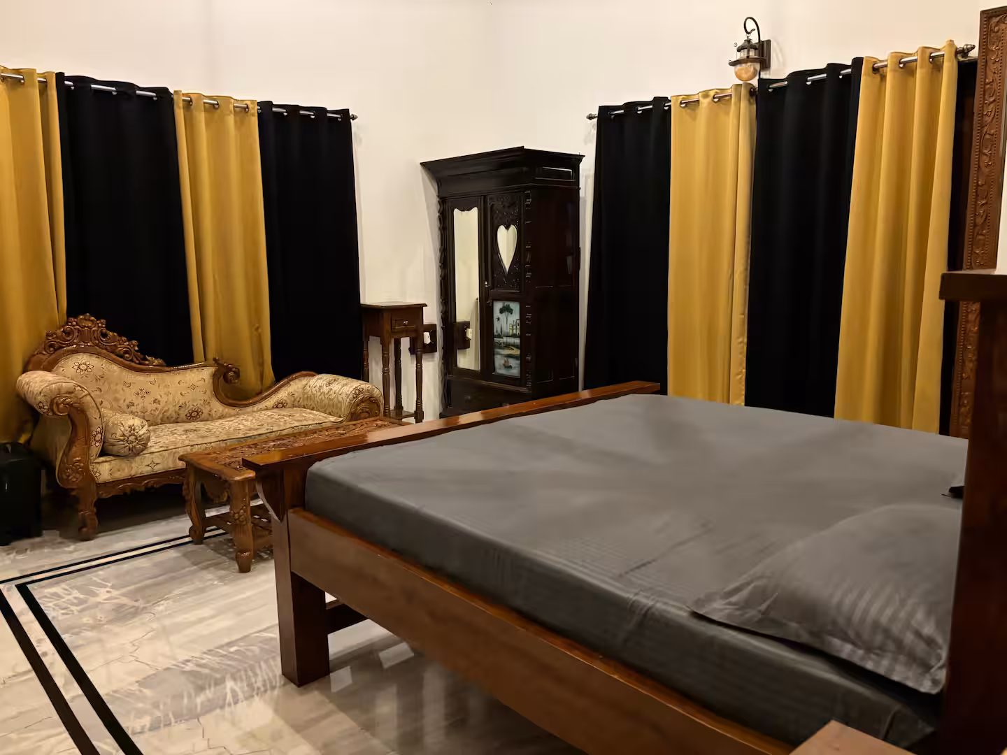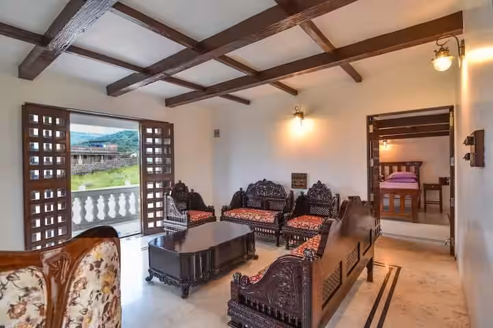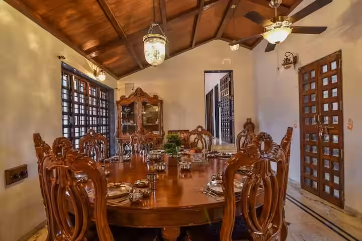We offer three air-conditioned bedrooms. Two are located in the main house, featuring king-sized beds, antique wooden trunks, and balconies with vintage benches perfect for morning coffee. The third room is a special “retreat within a retreat”—a detached suite with its own living room and entrance, offering privacy while still being part of the group.