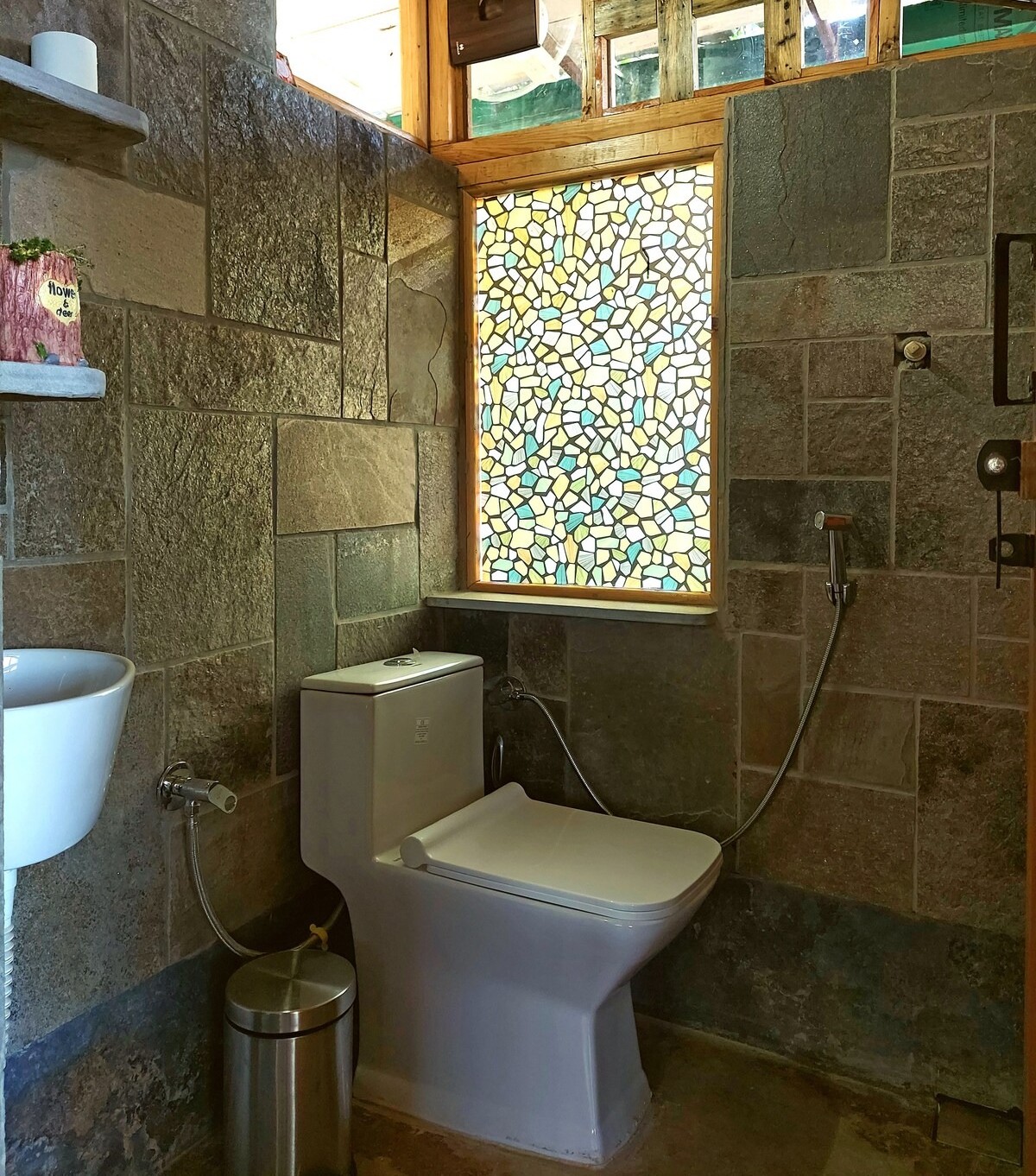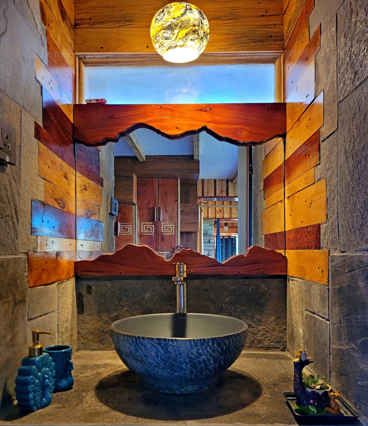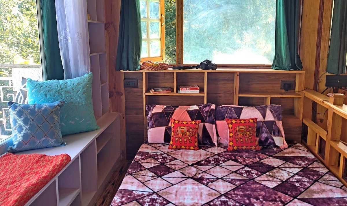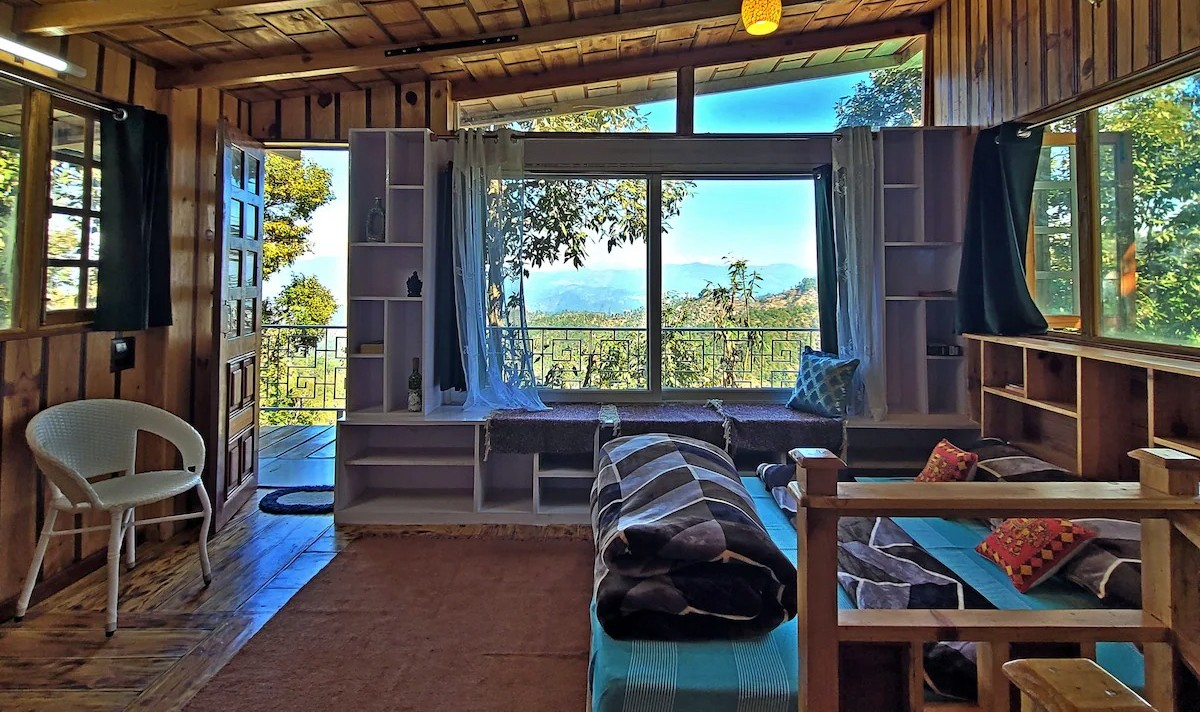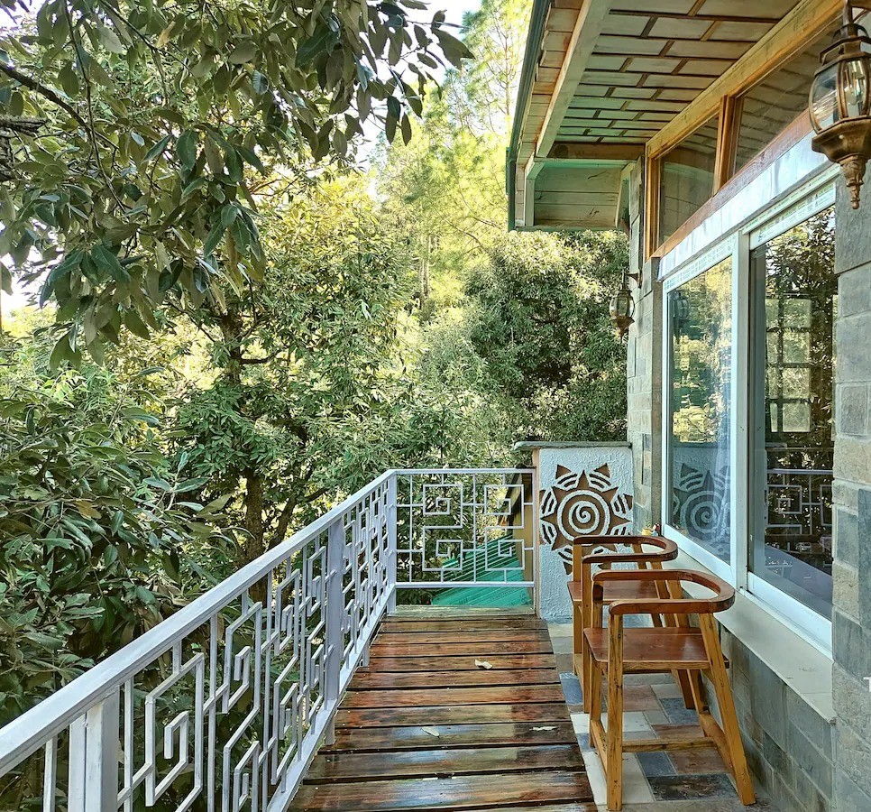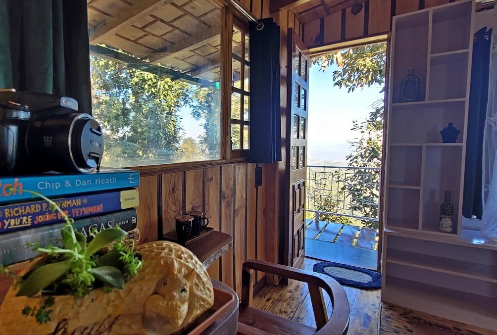• Upper Level: The upstairs loft area features another queen-size bed beside a wide window, a study table, a dressing area, and an attached western toilet. This floor opens up to a large balcony with stunning Himalayan views, making it the ultimate spot for your morning cup of tea.