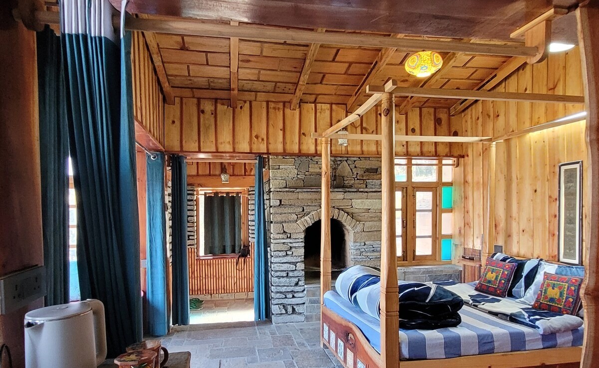 • Ground Floor: Features an elegant queen-size wooden bed positioned to take in the views from a spacious bay window framing Nanda Devi and its neighboring peaks. This level also includes a kitchenette, a cozy dining area, a closet/dressing space, and a bathroom with a hot shower.