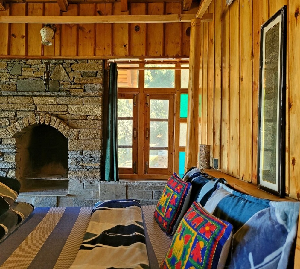 • The Angethi (Traditional Fireplace): The signature element of the studio is a beautifully crafted stone fireplace, built by balancing one stone at a time. It serves as the heart of the space—a perfect spot to warm your hands, chat while food cooks over the wood, and make memories together.