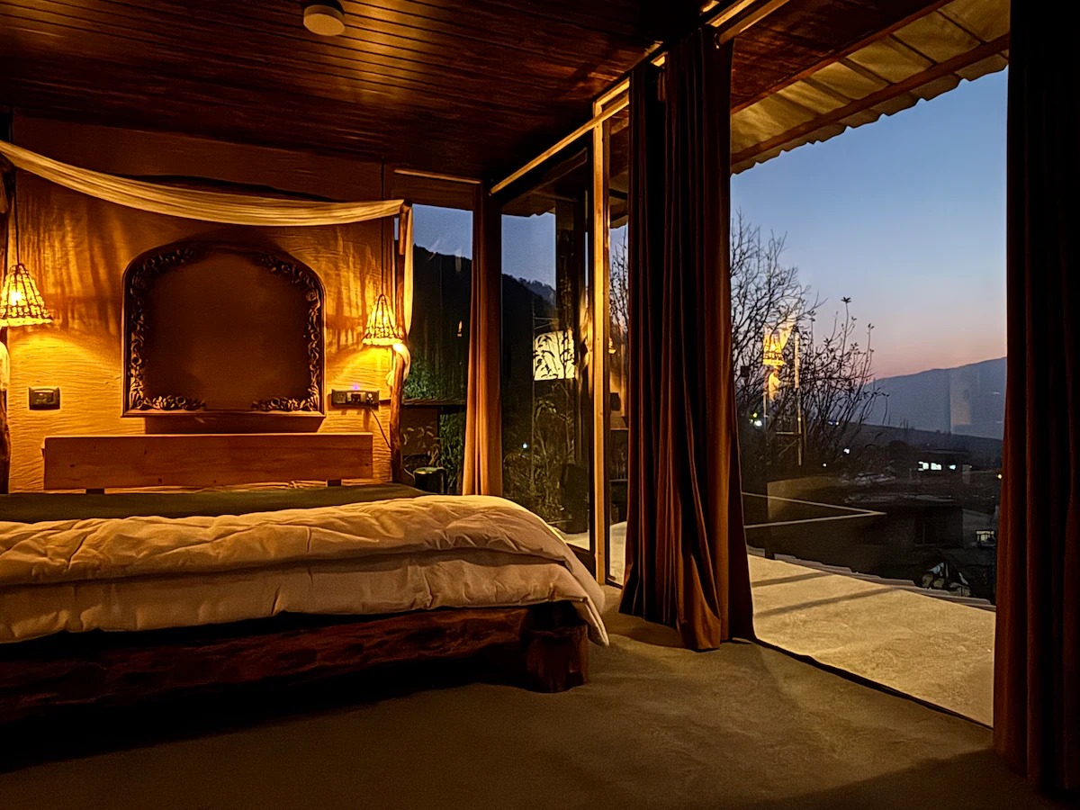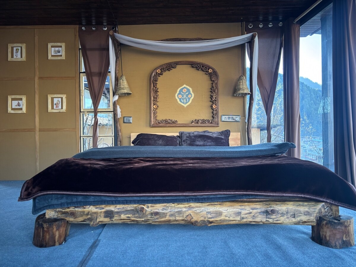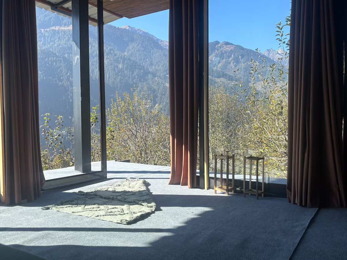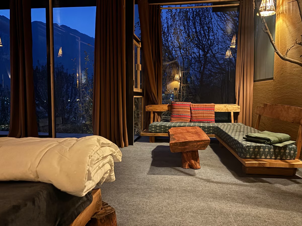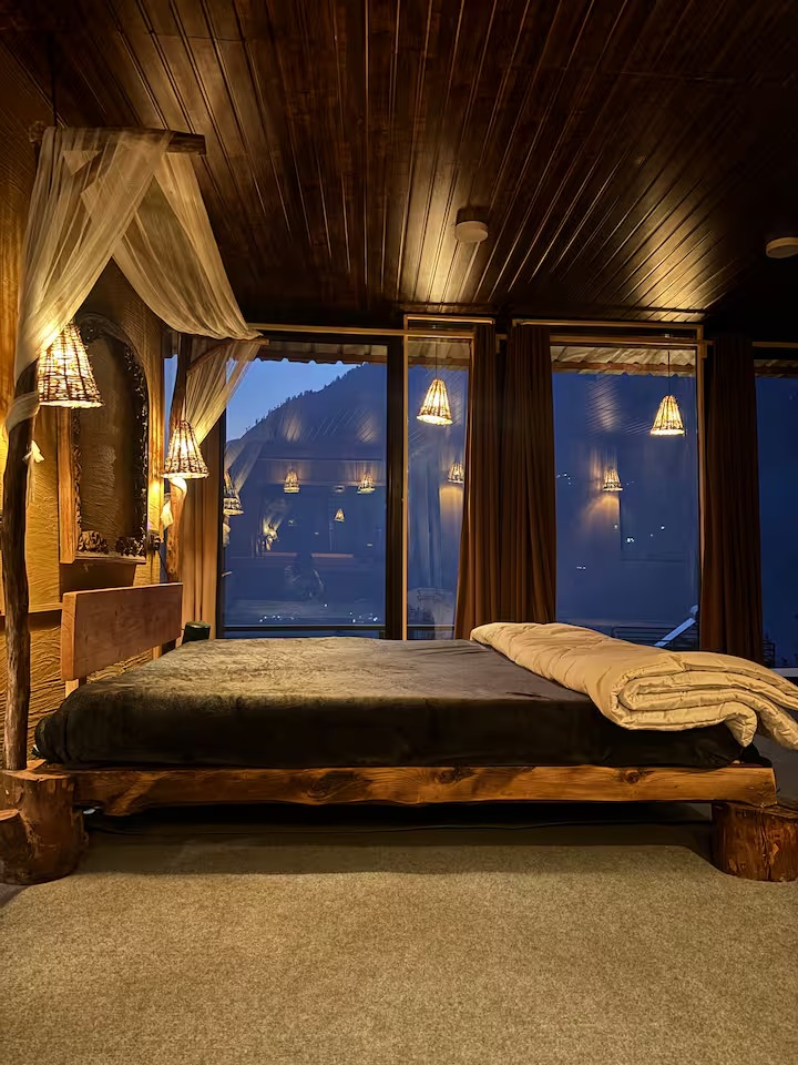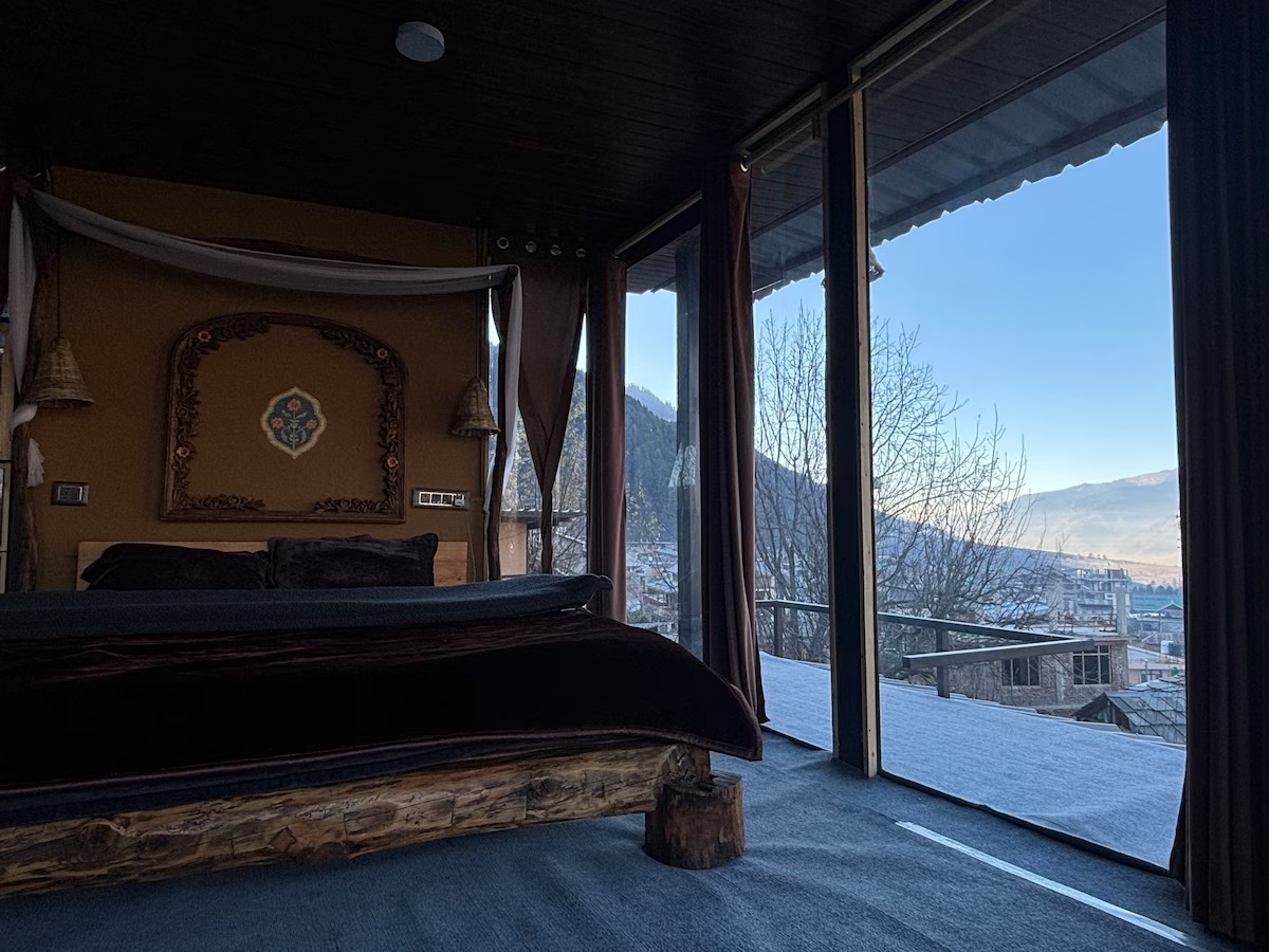 This private accommodation includes one bedroom with king bed, spacious seating, sit-outs, a beautiful cafe to work and chill, incredible sunset/sunrise view, waterfall view, Manali skyline and some of the famous peaks right from your huge window.
