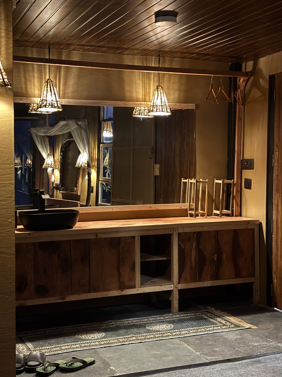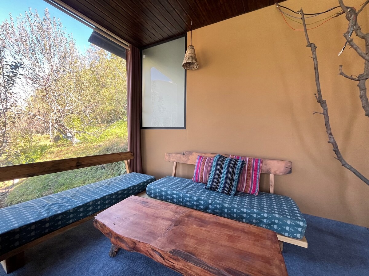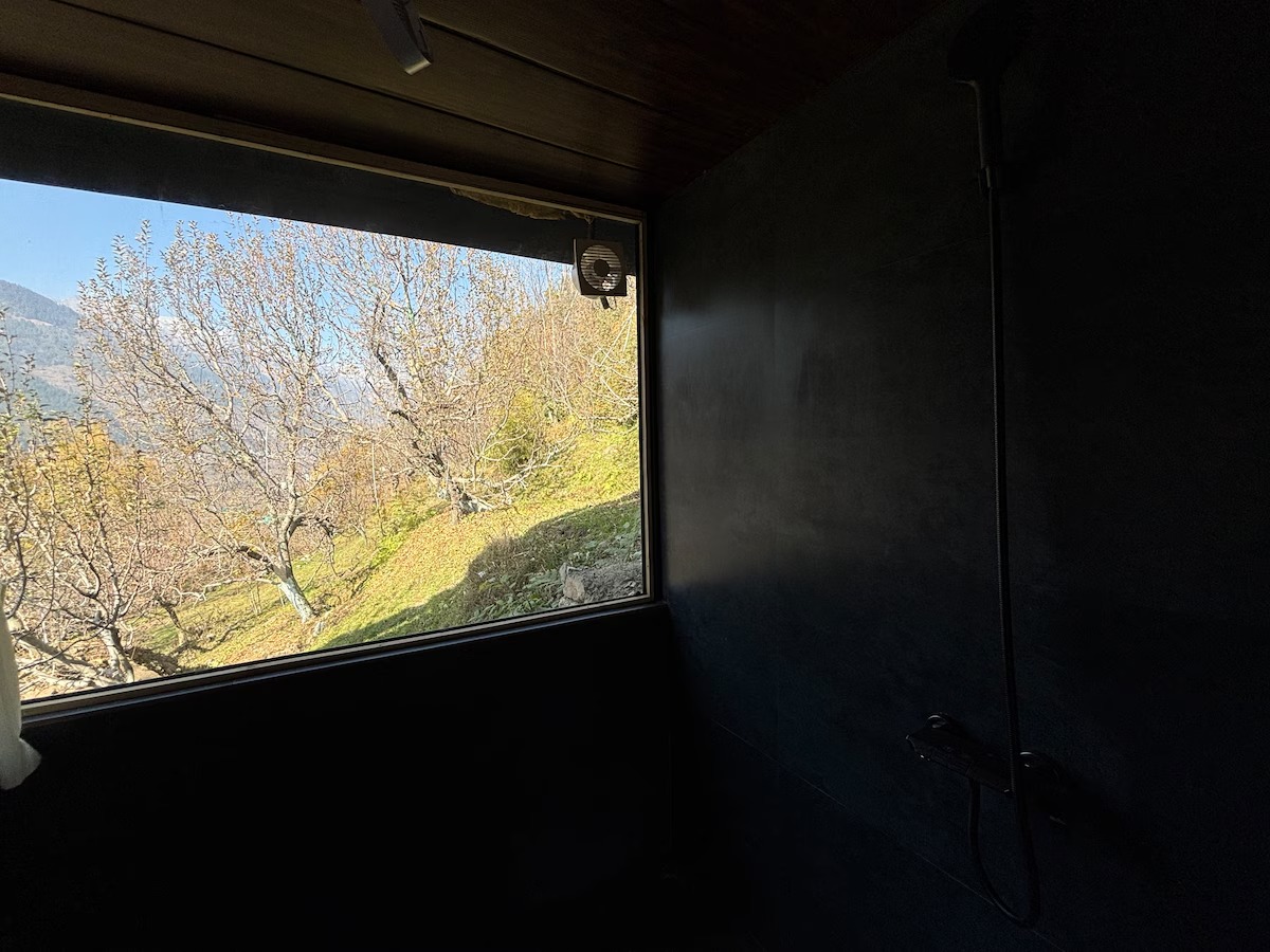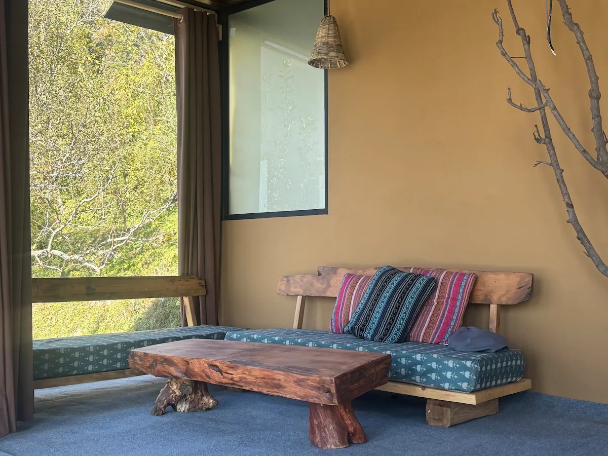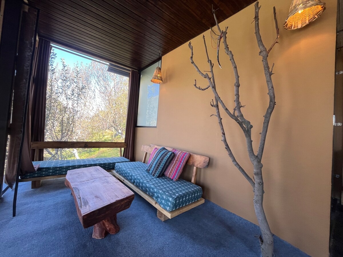 This private accommodation includes one bedroom with king bed, spacious seating, sit-outs, a beautiful cafe to work and chill, incredible sunset/sunrise view, waterfall view, Manali skyline and some of the famous peaks right from your huge window.