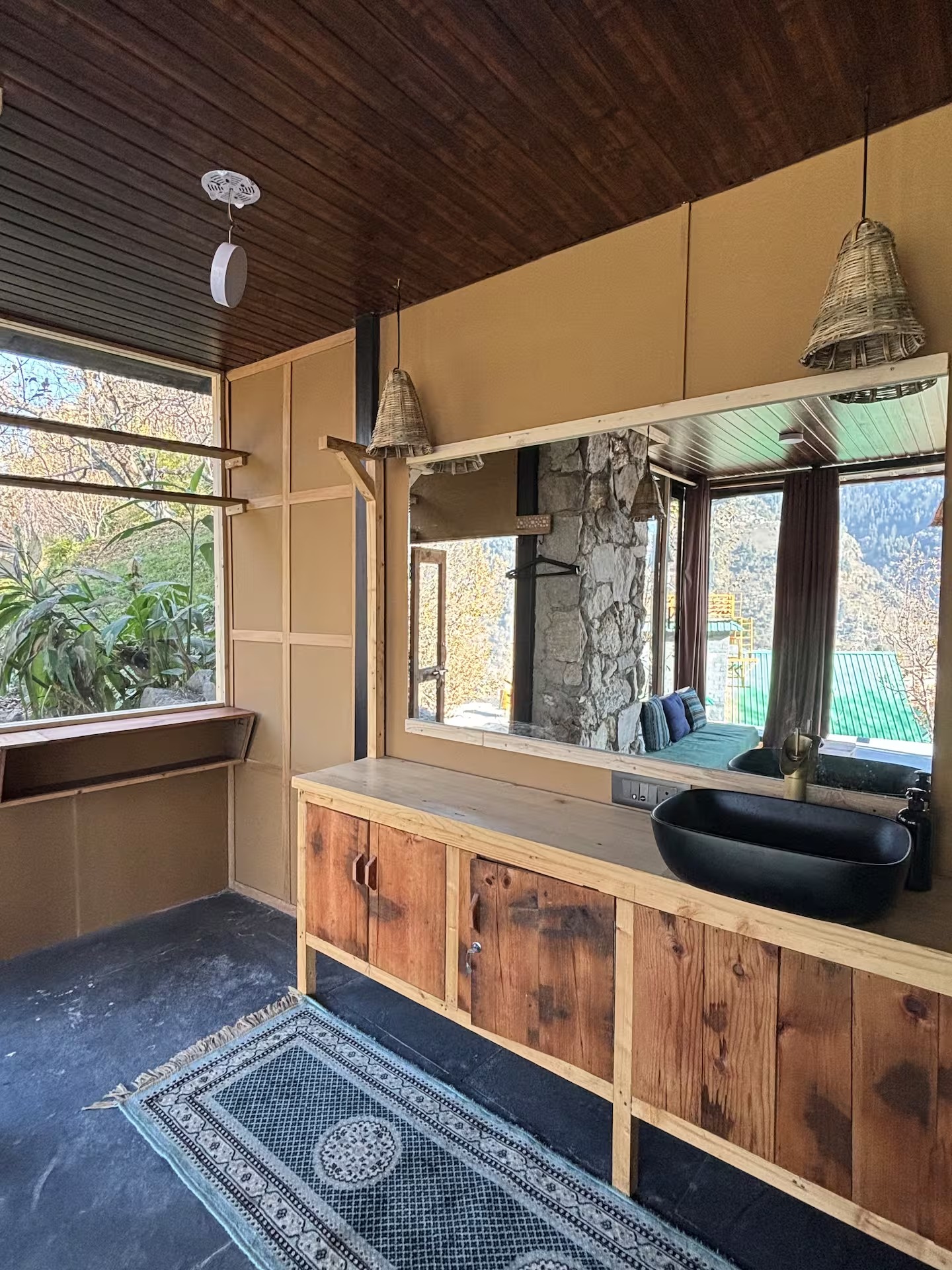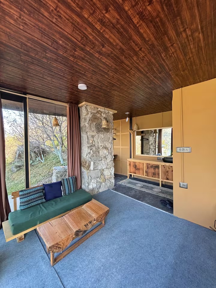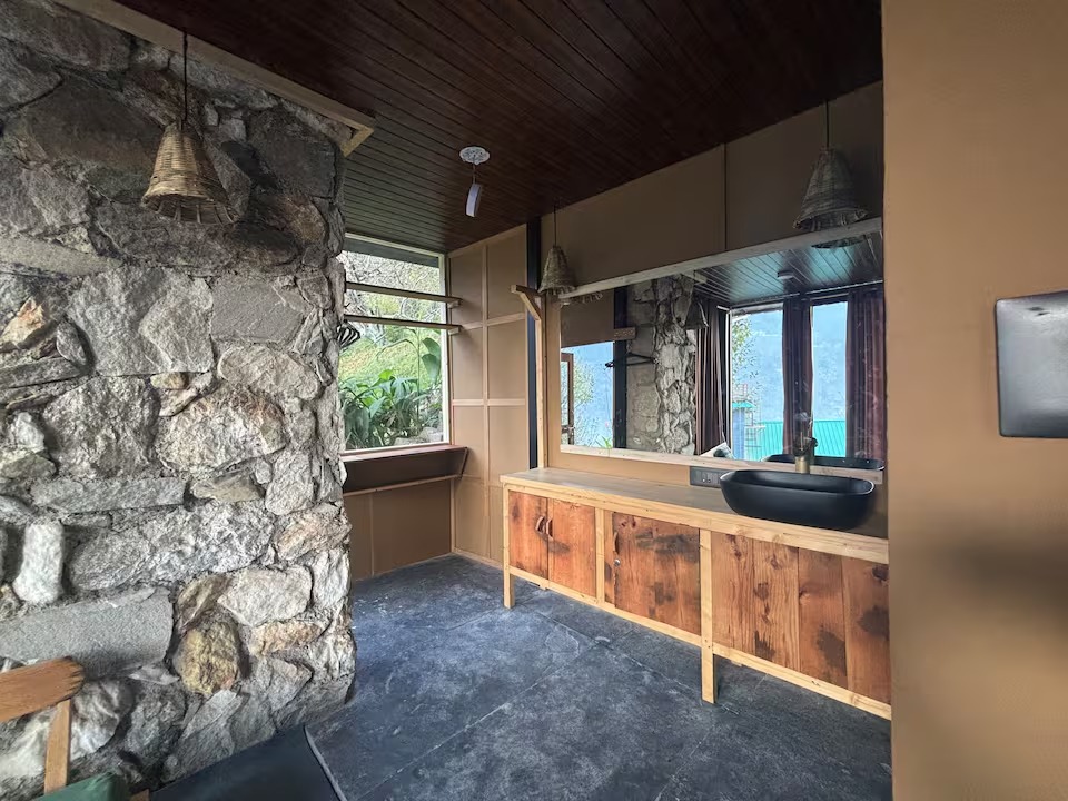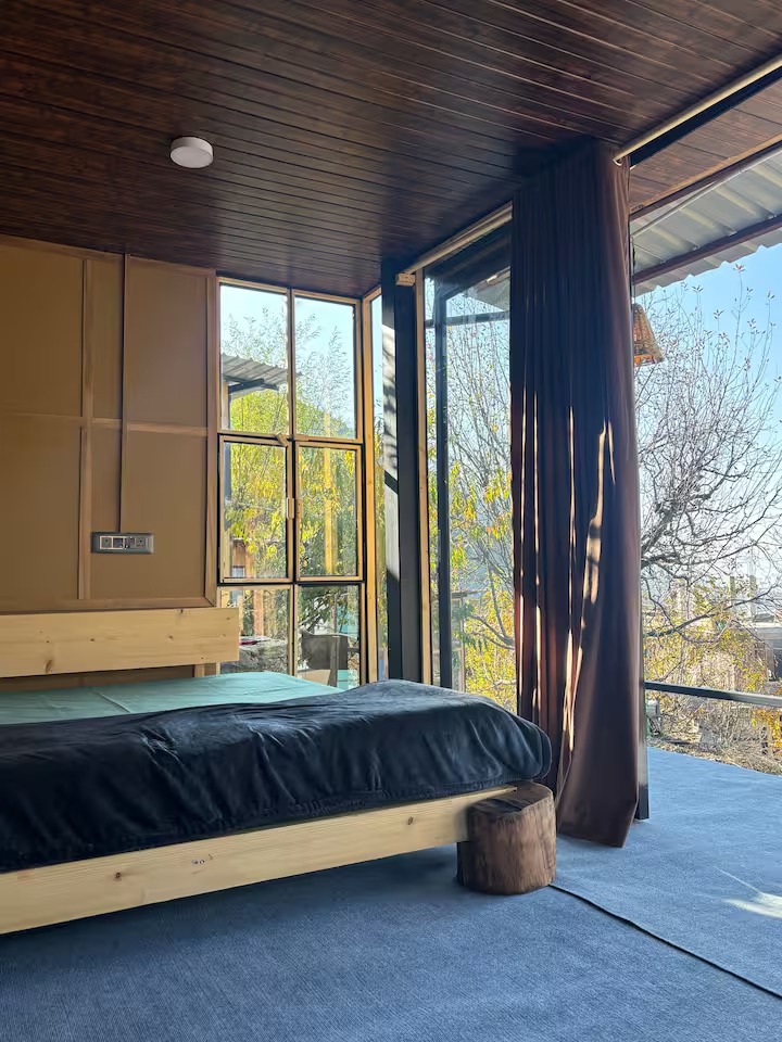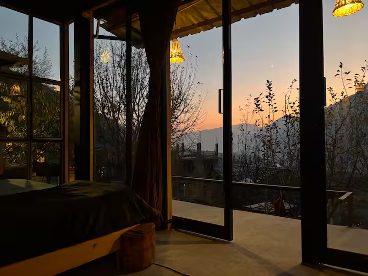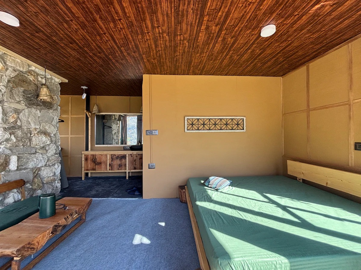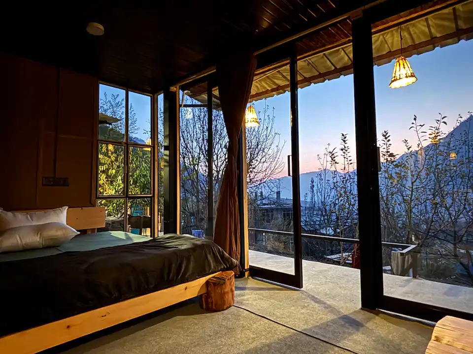 This private accommodation includes one bedroom with king bed, spacious seating, sit-outs, a beautiful cafe to work and chill, incredible sunset/sunrise view, waterfall view, Manali skyline and some of the famous peaks right from your huge window.