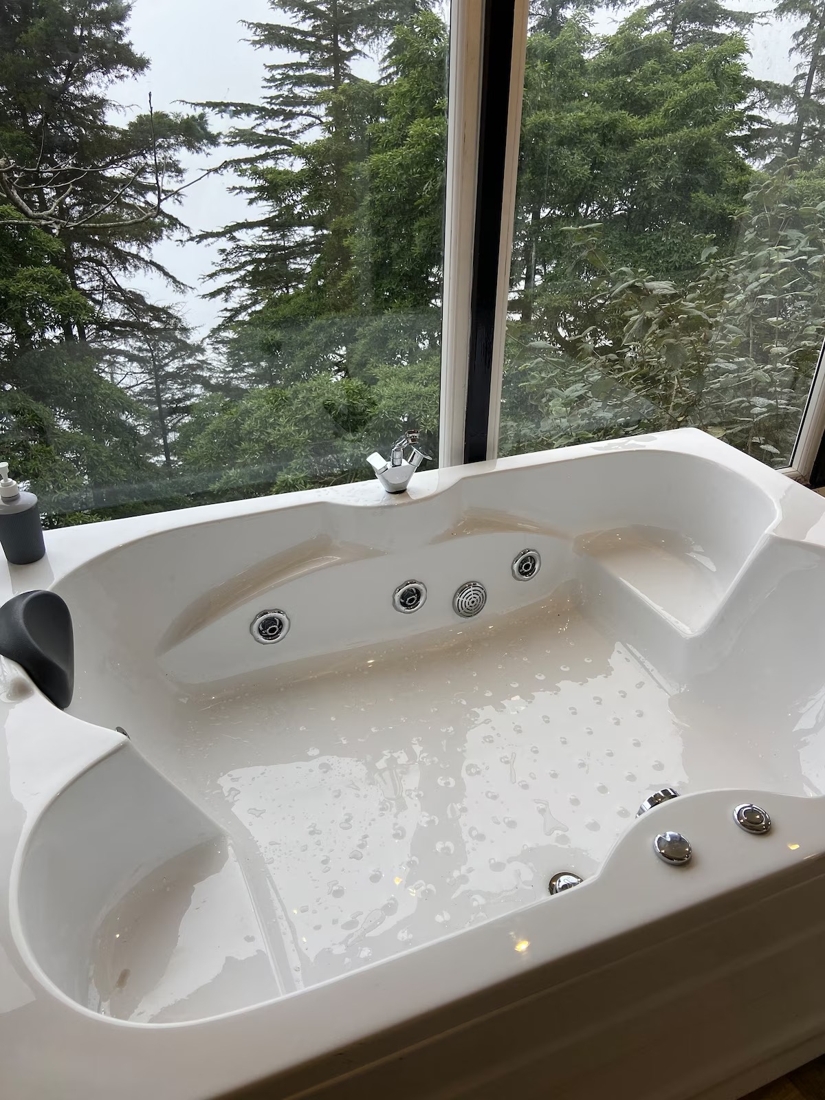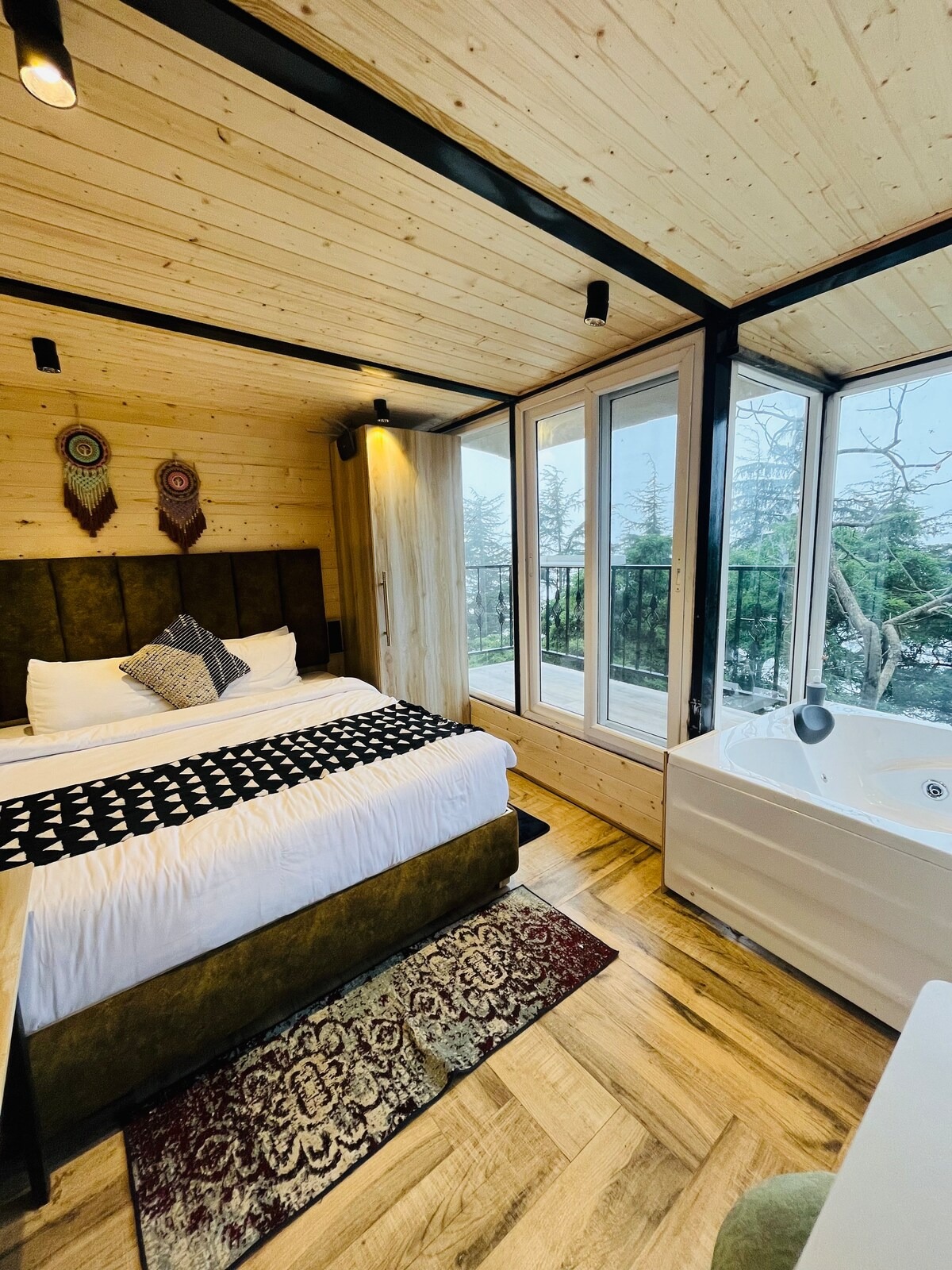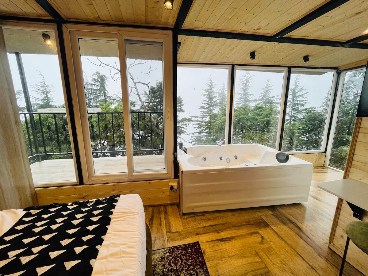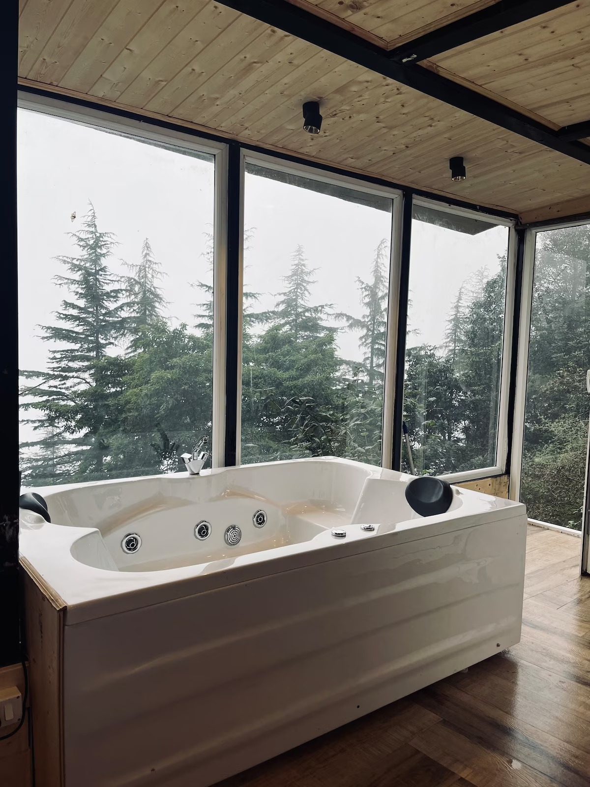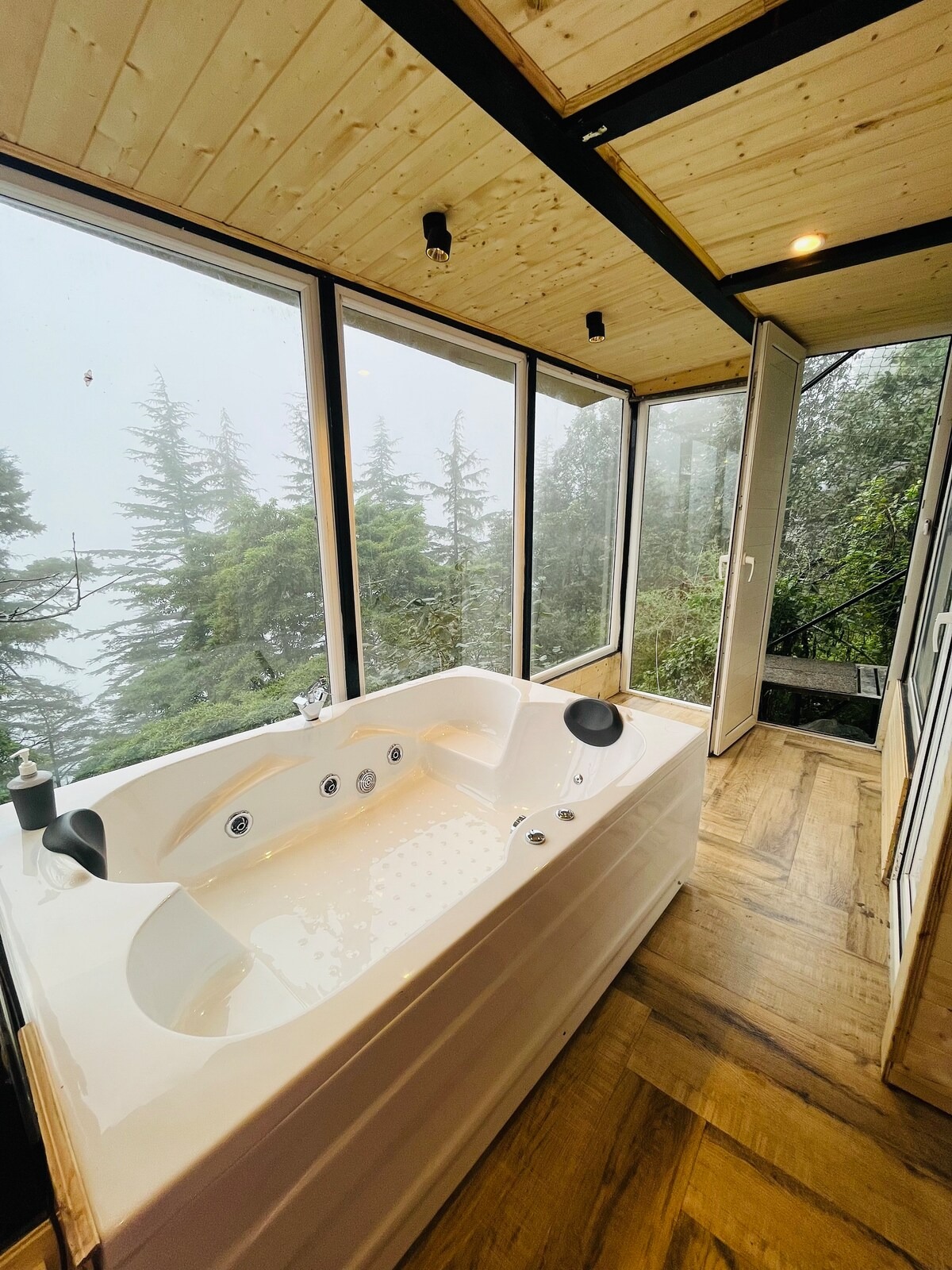 Welcome to “Nest,” our luxurious and tranquil cottage with balcony within Mussoorie, surrounded by lush forests and mountains. Enjoy modern amenities including an ensuite jacuzzi and a 1000L heat pump for continuous hot water, supported by a robust power backup system.