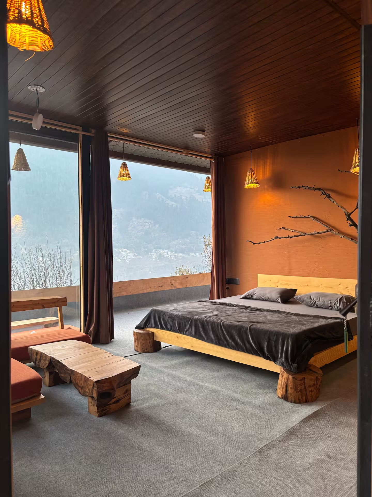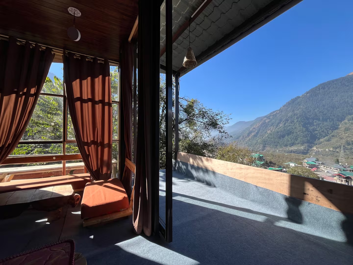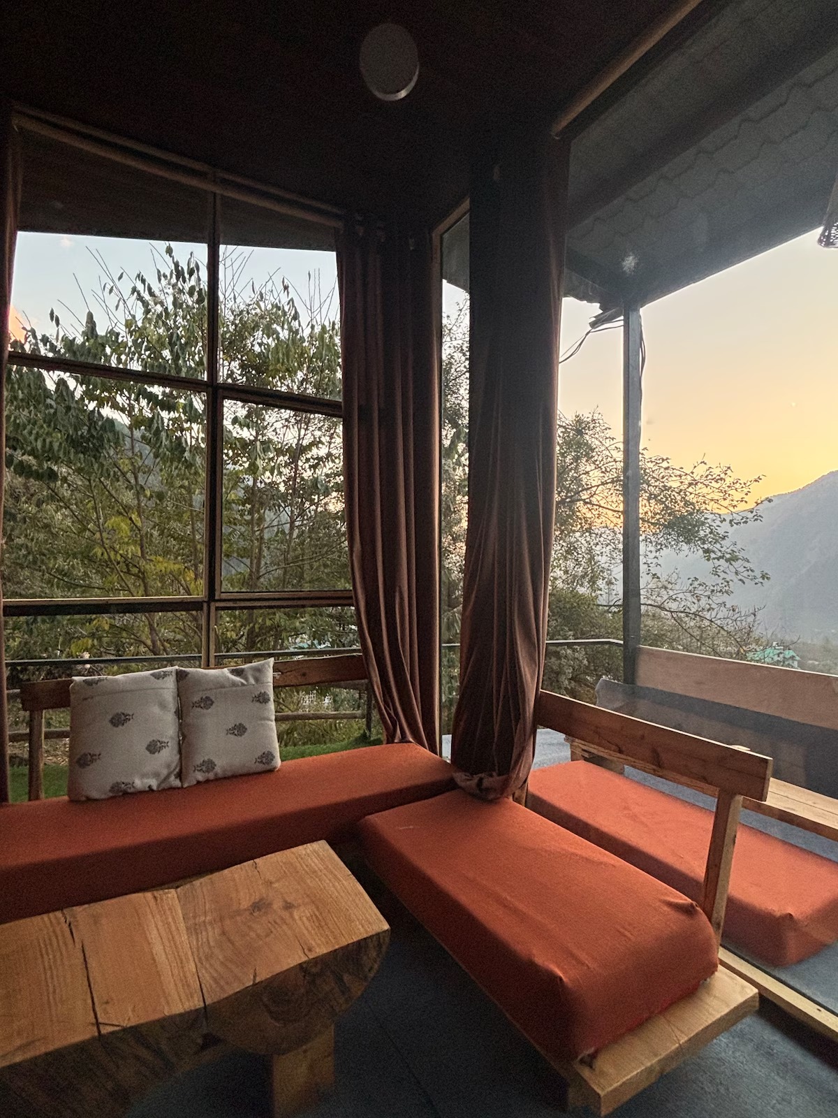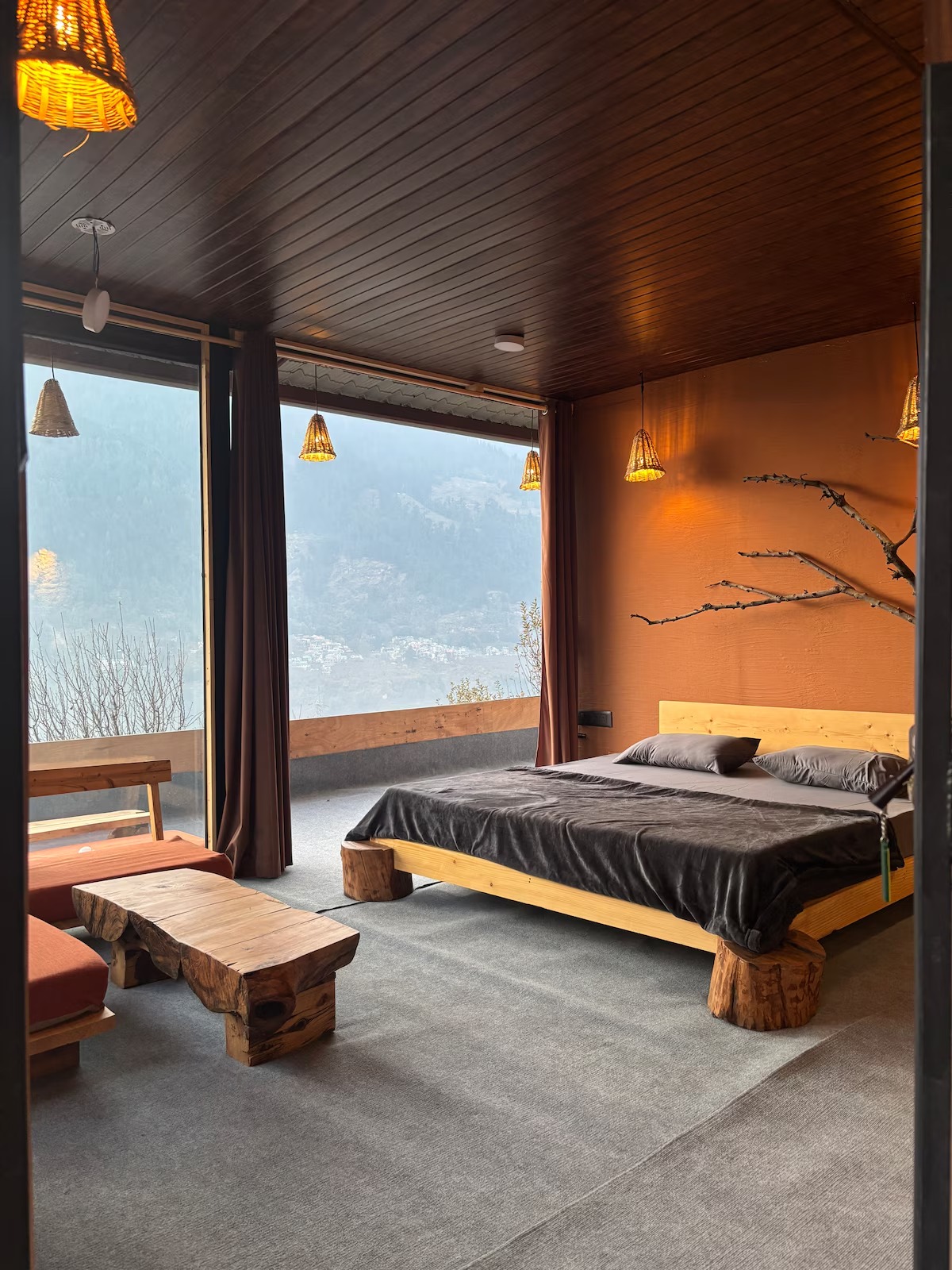 This private accommodation includes one bedroom with king bed, spacious seating, sit-outs, a beautiful cafe to work and chill, incredible sunset/sunrise view, waterfall view, Manali skyline and some of the famous peaks right from your huge window.