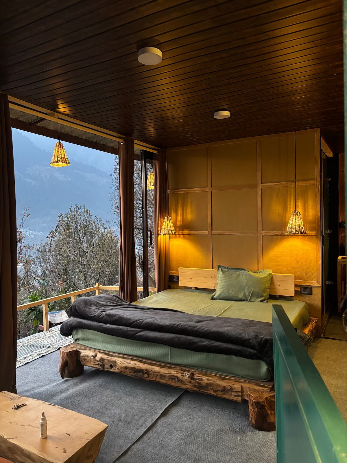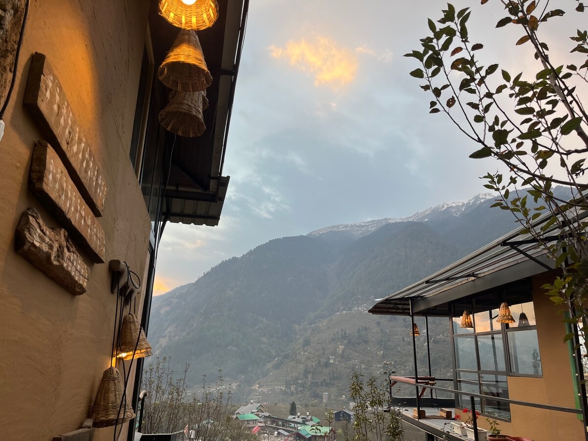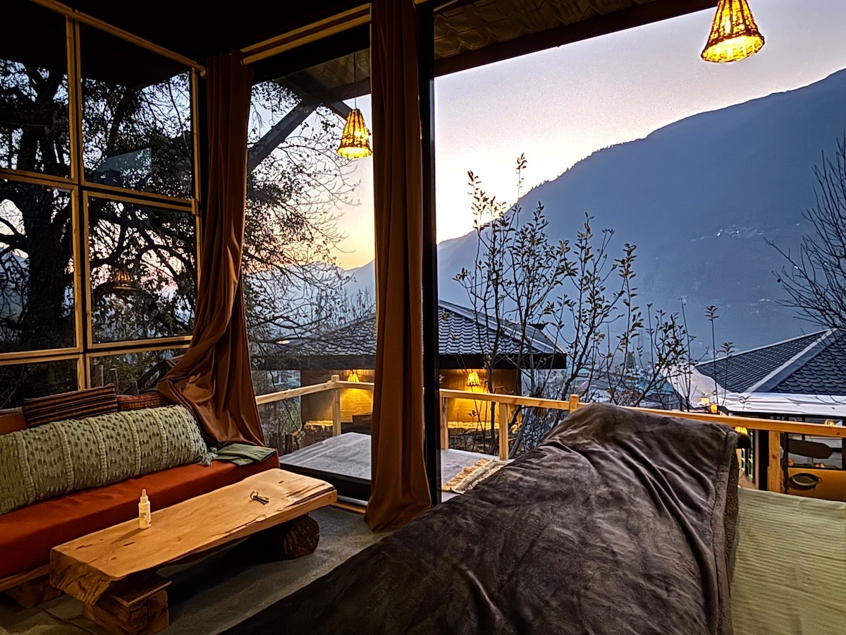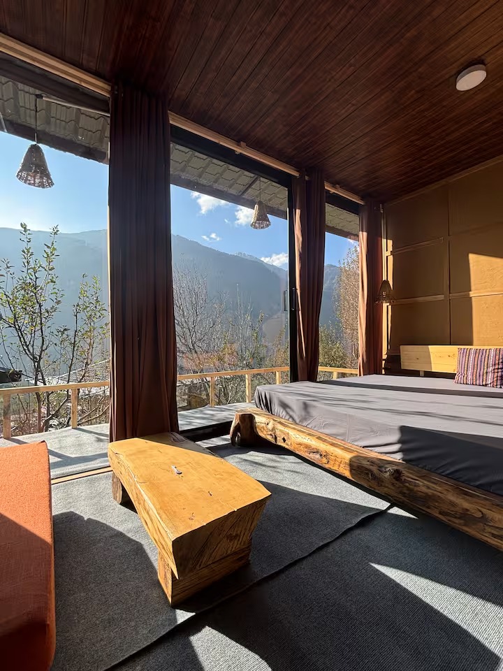 Step into a thoughtfully designed private room with a king bed, warm interiors, and a large window that frames breathtaking views of waterfalls, mountain peaks, and the Manali skyline.