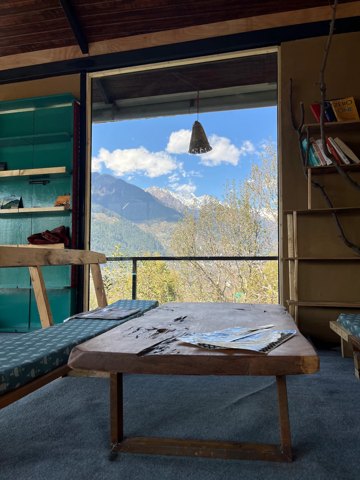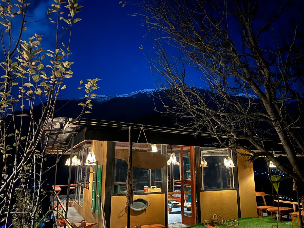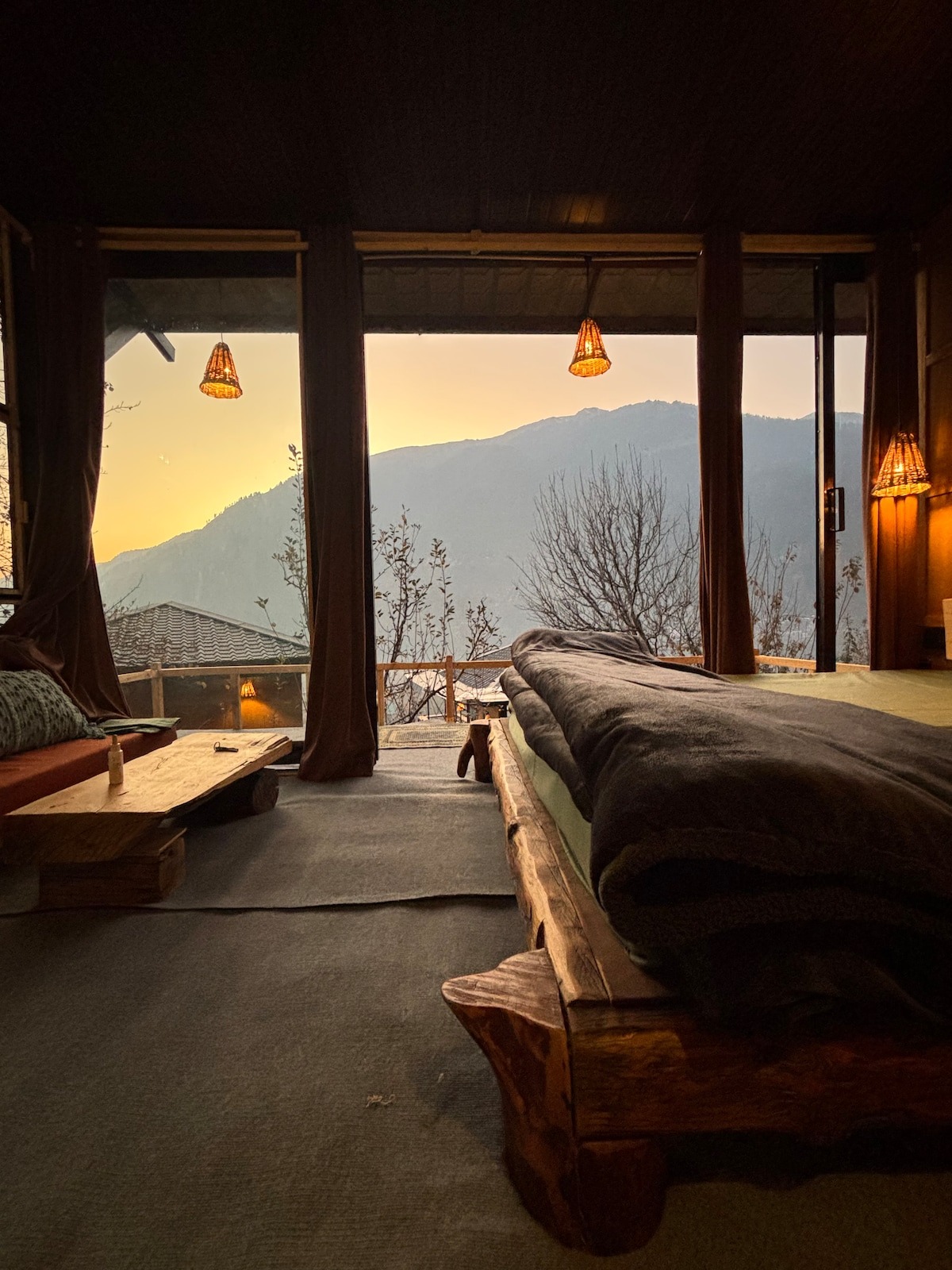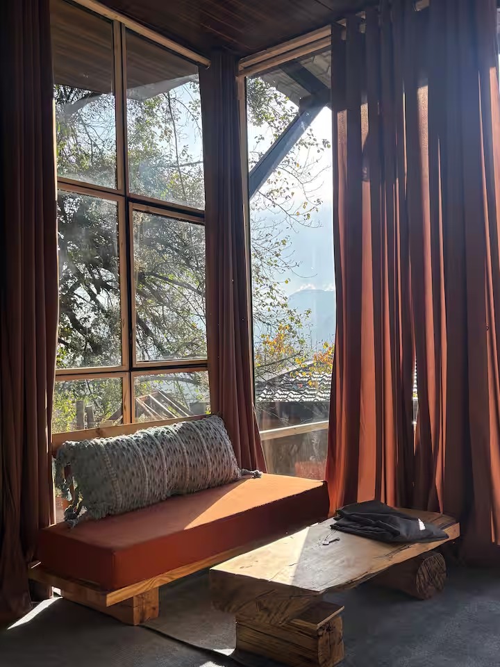 Step into a thoughtfully designed private room with a king bed, warm interiors, and a large window that frames breathtaking views of waterfalls, mountain peaks, and the Manali skyline.
