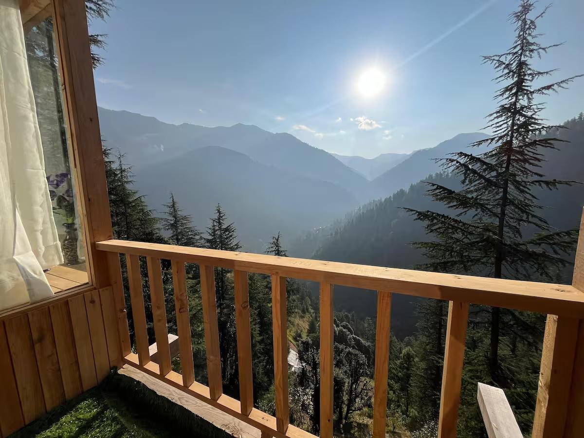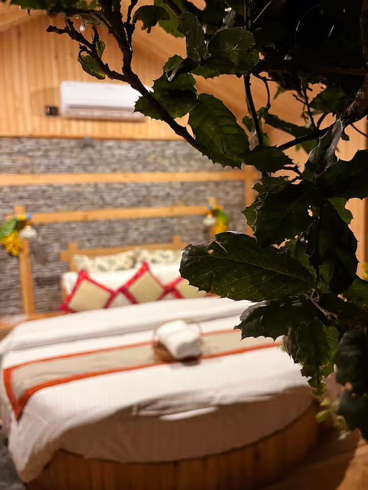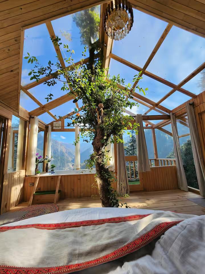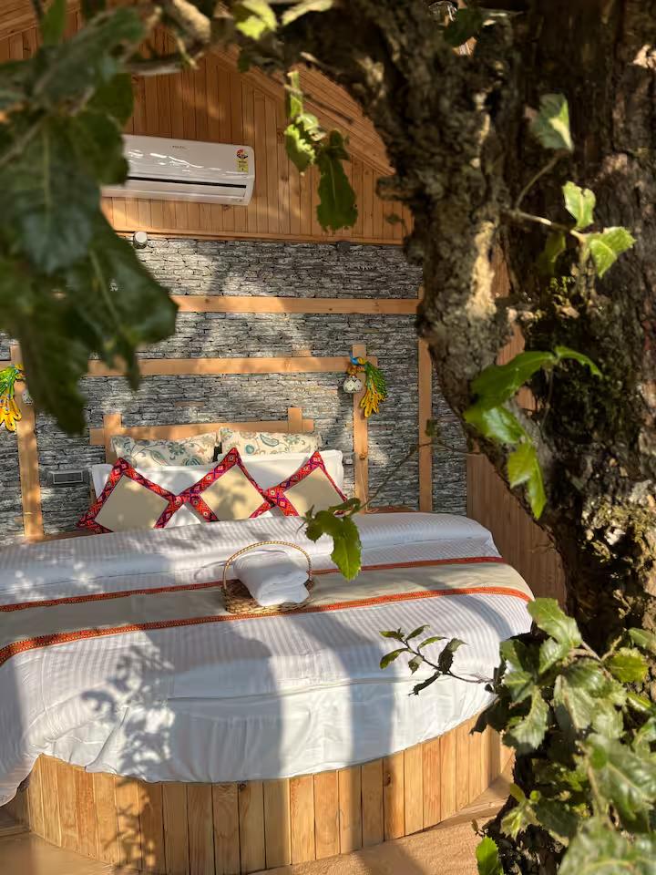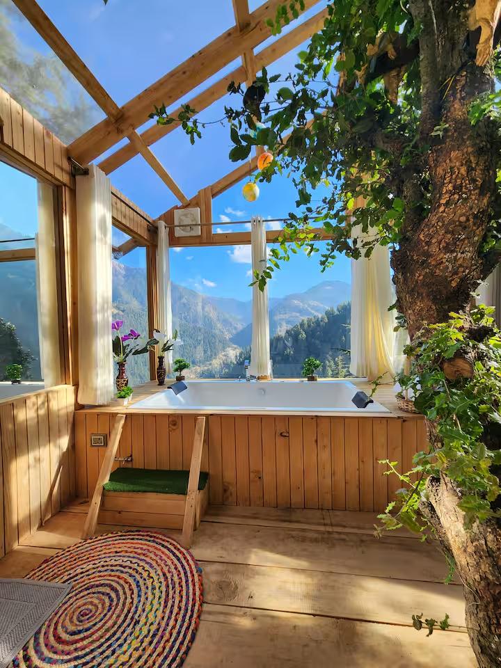 Escape to a unique treehouse getaway offering panoramic views of the snow-capped mountains and the breathtaking Jibhi Valley. This cozy retreat perfectly blends rustic charm with modern luxury. Relax in your private jacuzzi overlooking the peaks, or stargaze from the comfort of your bed through the unique transparent roof.